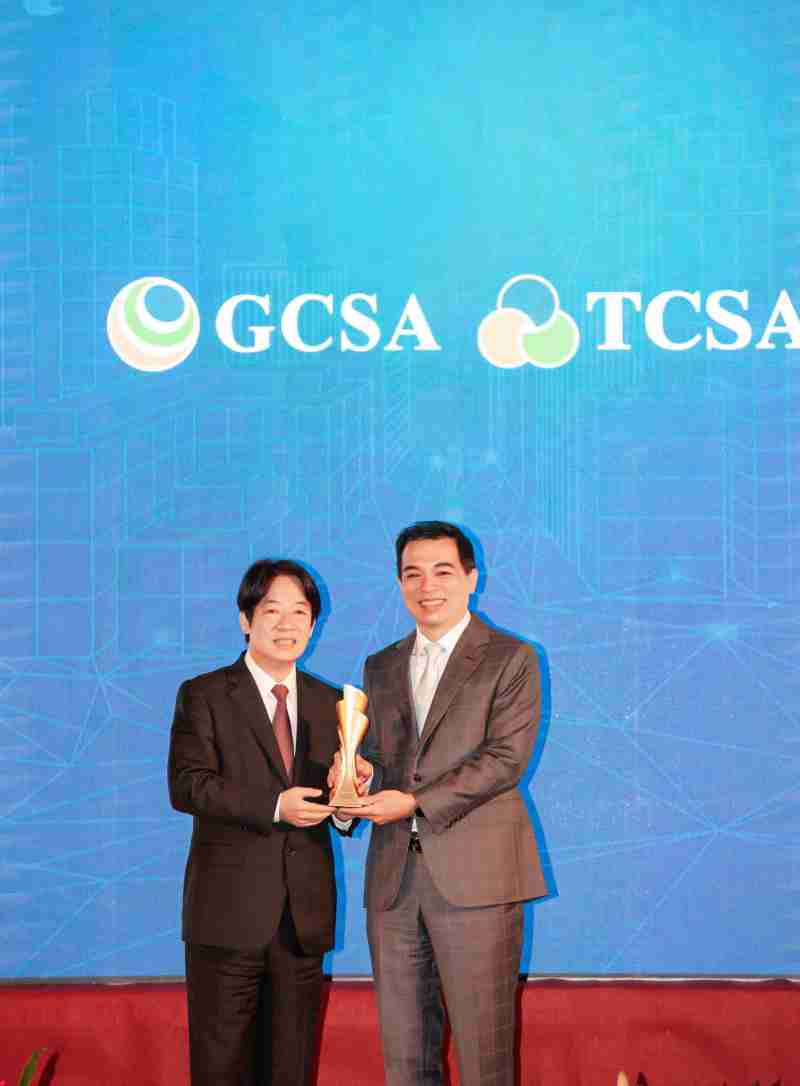 达全方位永续表现获全球永续奖及台湾永续奖肯定,,由副总统赖清德颁奖 (左),,,z6尊龙总经理柯富仁 (右) 代表领奖