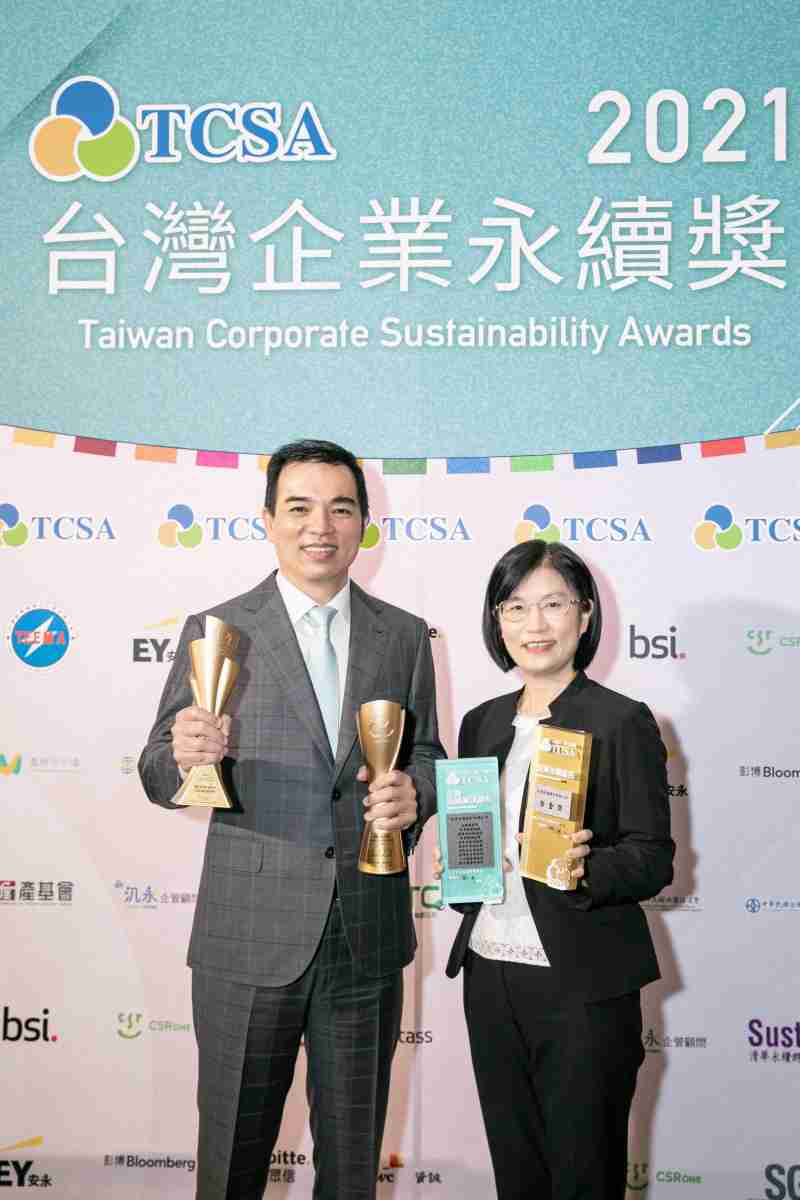达在台湾永续奖所评比环境、、、、社会、、治理等各面向的永续绩效均获高度肯定 (左:z6尊龙光电总经理暨营运长柯富仁,,右:z6尊龙光电永续长古秀华)
