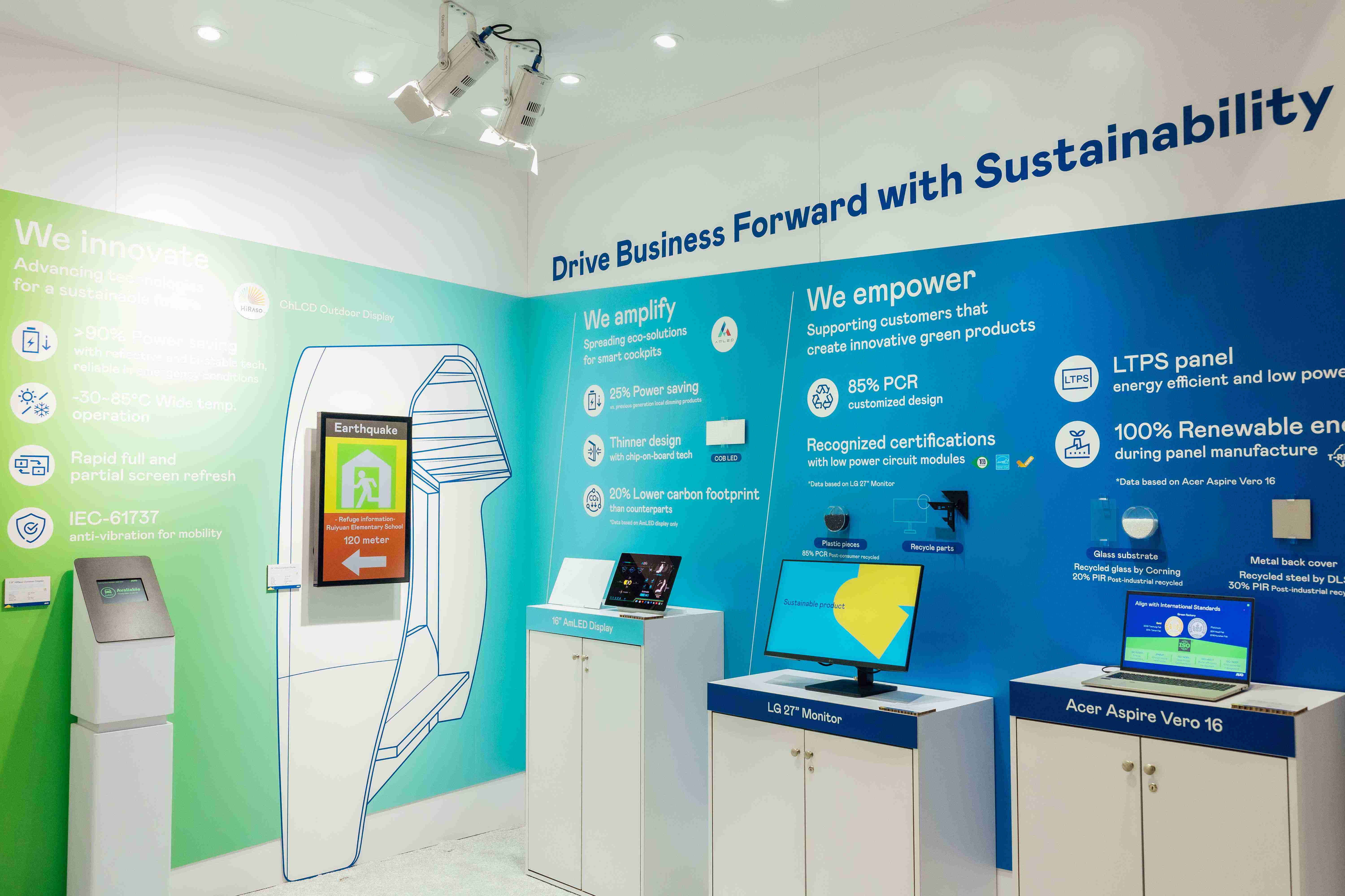 z6尊龙运用创新显示技术HiRaso胆固醇液晶双稳态技术达到显示零耗能、、、扩大节能省电的AmLED显示技术应用于车用产品、、、、以再生的消费后回收(PCR)塑料及全绿电生产之面板,,,应用于笔电及萤幕,,,,增加绿色价值。。。。