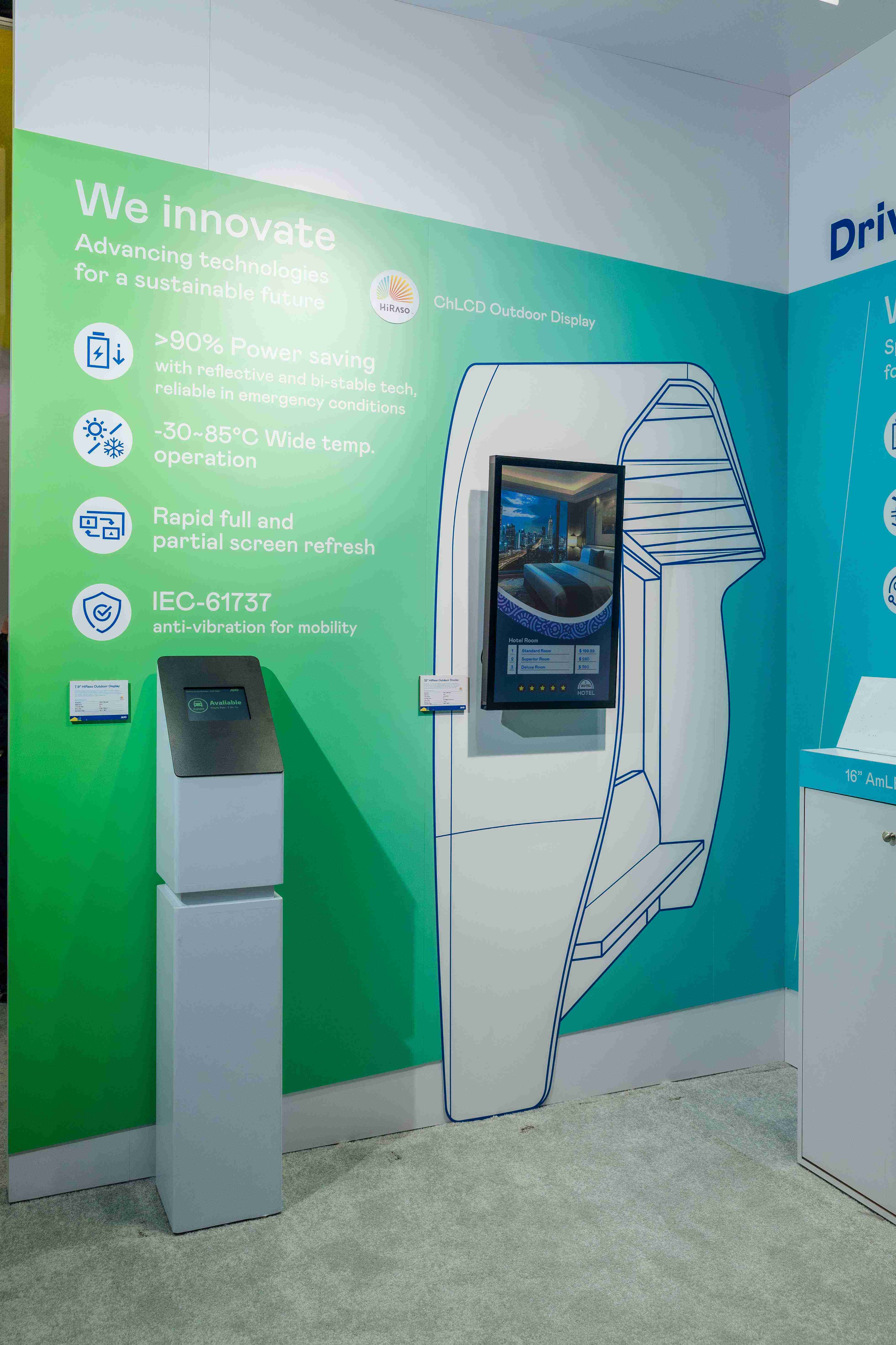 HiRaso胆固醇液晶显示器运用反射环境光线的方式,,呈现影像显示时零耗能的环保省电诉求,,光线愈强愈能呈现绝佳的色彩饱和度及显示效果,,,,同时在摄氏-30度至85度间宽温的使用优势,,为户外电子看板的新首选。。。