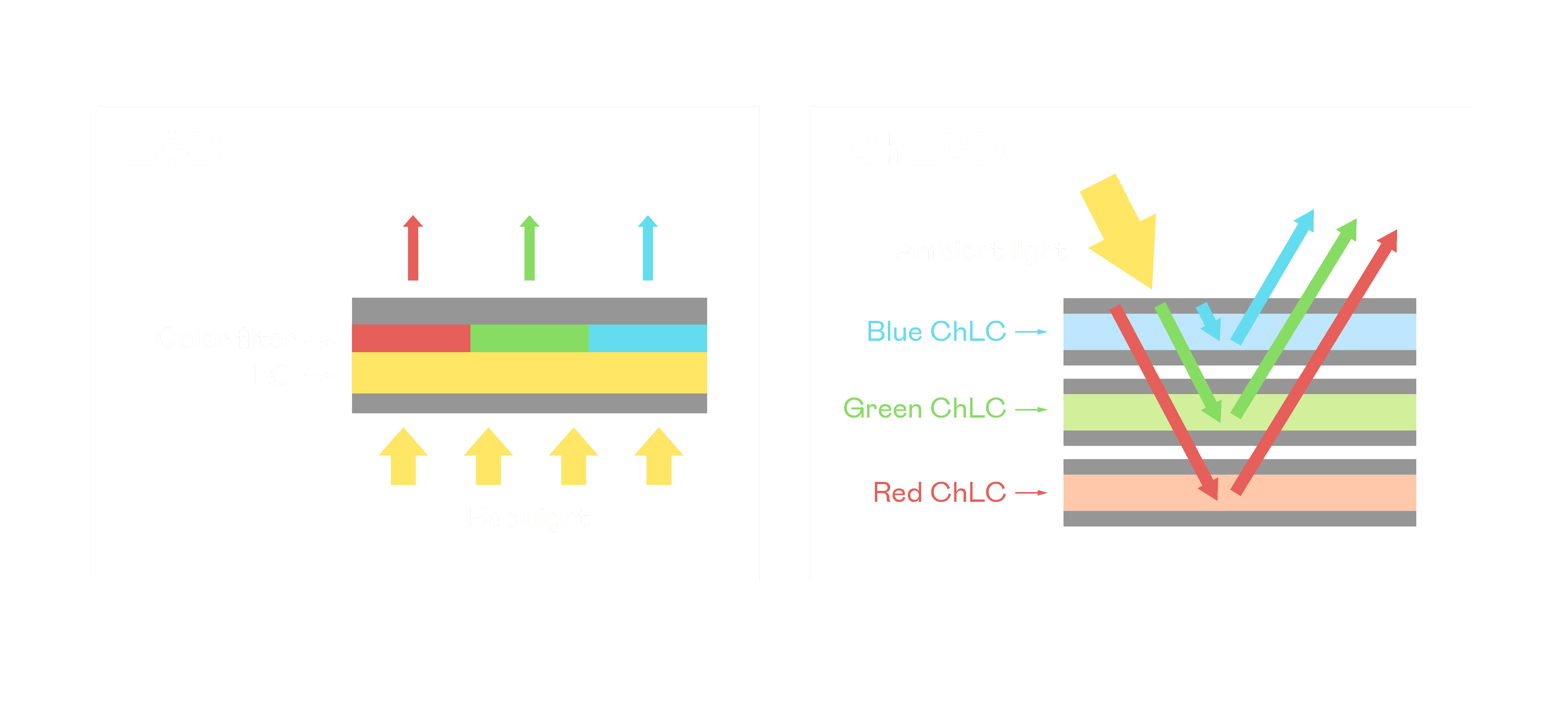 ChLCD 胆固醇液晶就如同纸张一样,,透过反射环境光来显示影像,,,因此长时间观看不易造成人眼视觉疲劳,,,,可达到护眼效果。。当处于户外阳光下使用,,LCD 影像容易失真而不易观看,,,,但胆固醇液晶仍可维持较佳的影像品质。。