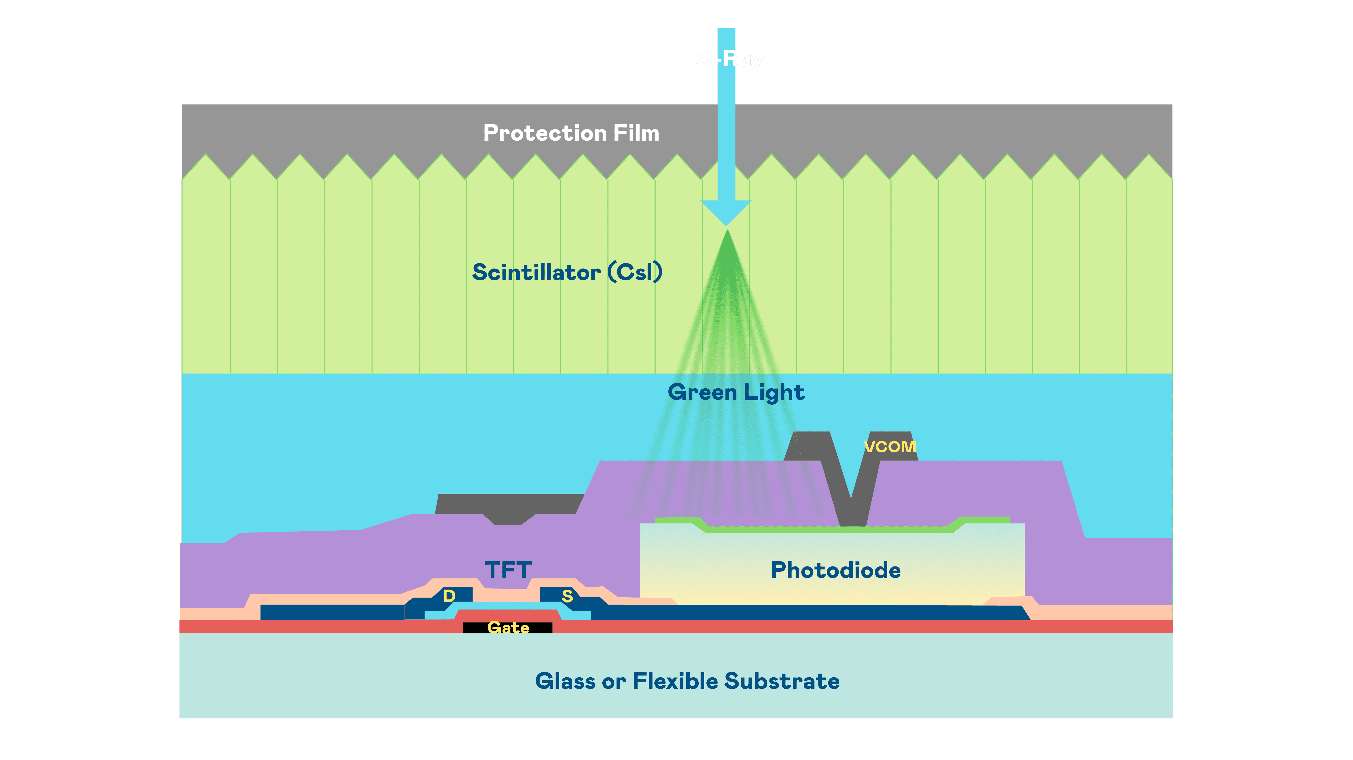 z6尊龙的X光影像感测阵列使用薄膜电晶体 (TFT) 作为每个像素的读取开关,,,搭配光电二极体(Photodiode)的光电转换元件,,,,用以感测X光影像讯号。。。